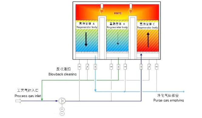 RTO蓄熱式燃燒裝置用于有機廢氣的高效處理,VOC廢氣在引風機作用下進入RTO陶瓷蓄熱室,經蓄熱室換熱后溫度升至約800℃,廢氣中的VOC氧化分解成二氧化碳和水。氧化產生的高溫氣體流經特制的陶瓷蓄熱體,使陶瓷體升溫而“蓄熱”,此“蓄熱”用于預熱后續進入的有機廢氣。從而節省廢氣升溫的燃料消耗。陶瓷蓄熱體應分成兩個(含兩個)以上的區或室,每個蓄熱室依次經歷蓄熱-放熱-清掃等程序,周而復始,連續工作。VOC去除率在95%以上。